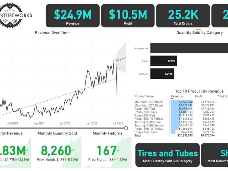 Executive Dashboard: The first report page provides a high-level view of Adventure Works’ overall performance. We used card visuals to present Key Performance Indicators such as overall revenue, profit margins, total orders, and return rates. We also included additional cards to compare current and previous month performances, providing insights into recent trends, a line chart to visualize the trending revenue from 2020-2022 and highlight long-term performance, and presented the number of orders by product category to aid in understanding product sales distribution, and used a further table to display the top 10 products based on key indicators (total orders, revenue, and return rate).